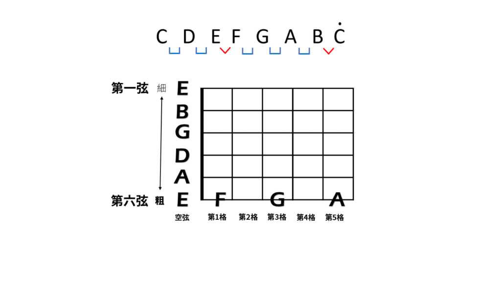 會發現除了第三弦,每條弦的第五格都跟下一弦的空弦,是同一個音(第三弦是第四格)。因此當你調好某條弦之後,可以利用這個方法來聆聽下一條弦大概是什麼音高,用耳朵聆聽並對比音高,就比較不會調到超過且斷掉了。