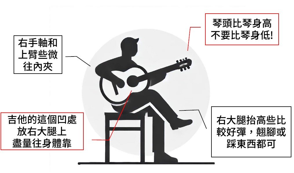 琴的凹槽處放在右大腿上,琴盡量往身體上靠近,可以翹右腳。記住琴頭不可以往下墜,所以要用右手的食指靠近虎口的關節(不是虎口!)或大拇指來做支撐的動作。